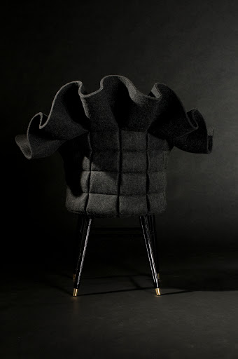 For Fredrik jobber med noe som jeg selv synes er noe av det heiteste innenfor møbeldesign for tiden. Å bruke tekstil i møbler er selvfølgelig noe som er gjort i alle år, men det som har vært gjort fram til nå er mest å bruke møbel som et dekke for alt som er inni selve møblet, og som blir en dekor. Det han tar tak i er å bruke tekstilet som et konstruktivt element i seg selv, at møbelet består av omtrent bare tekstil. (Dette var det jeg hadde tenkt å se på i mastersøknaden min, men som jeg ikke leverte. Jeg skal jo uansett ha fri neste år!! Hurra!) Et annet eksempel på dette er Nobody Chair som Hay lager, og som den danske designerduoen Komplot har designet.